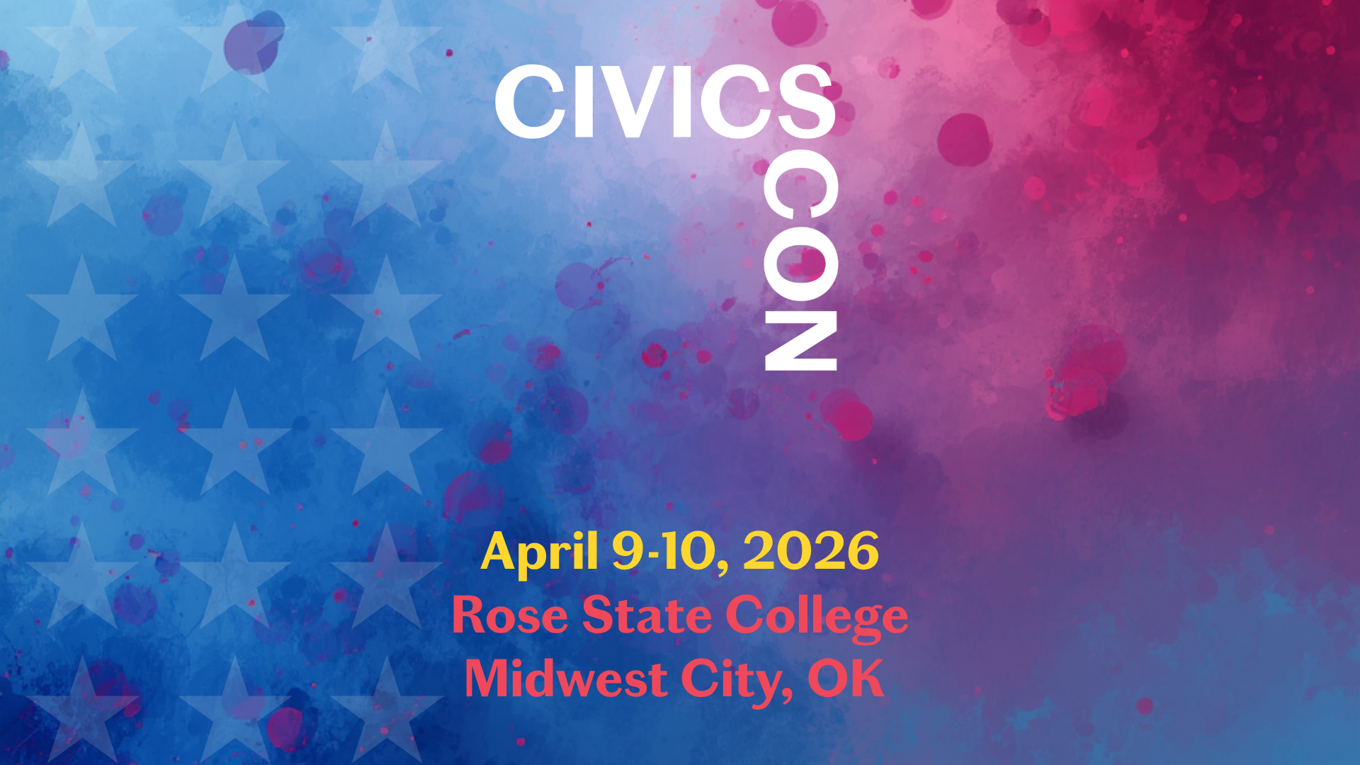 Back to All Events CIVICS CON Friday, April 10, 2026 4:00 PM 5:00 PM Rose State College Student Union 1720 Hudiburg Dr. Midwest City, OK 73110 (map) Google Calendar ICS Visit CivicsCon.com to view the agenda and purchase tickets!